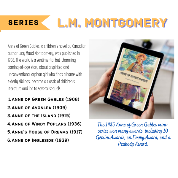 Anne of Green Gables, a children's novel by Canadian author Lucy Maud Montgomery, was published in 1908. The work is a sentimental but charming coming-of-age story about a spirited and unconventional orphan girl who finds a home with elderly siblings, became a classic of children's literature and led to several sequels.